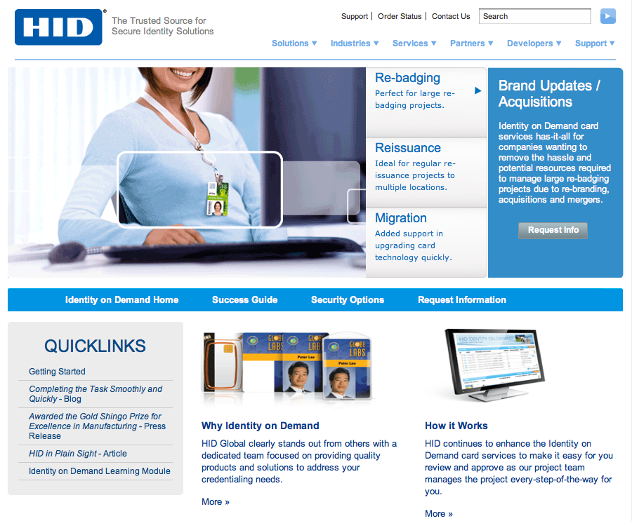 HID Global’s proven Identity on Demand services are designed for corporate end users, but sold through HID’s experienced channel partners who leverage HID’s tools, dedicated project management team, service resources and bandwidth on behalf of their customers. The Identity on Demand services take full advantage of the company’s Genuine HID™ value proposition, which stresses the highest levels of global product quality and delivery performance. Visit the new Identity on Demand web portal at http://www.hidglobal.com/iod-services.